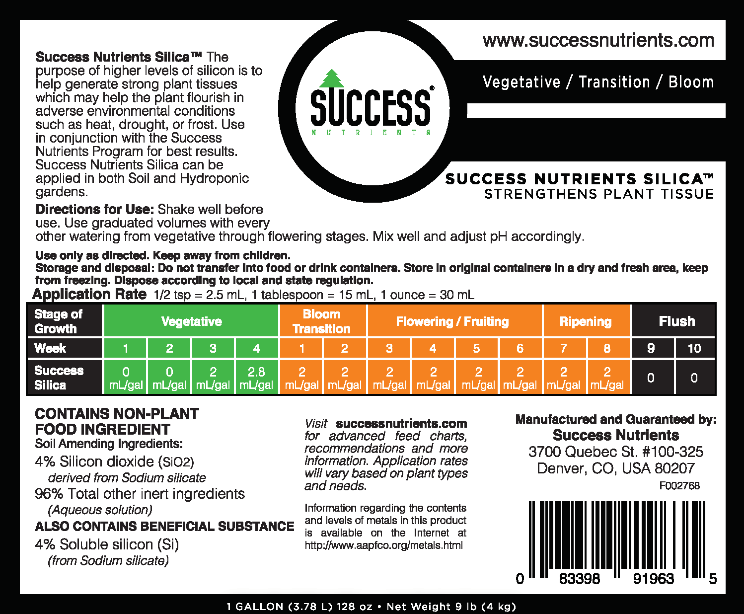 Silica™ is a beneficial supplement to be used in conjunction with Success Nutrients plant and food supplements. Strong plant tissues are generated from higher levels of silicon that helps the plant flourish in adverse environmental conditions such as heat, drought or frost. Silica is very effective in both Soil and Hydroponic gardens.
